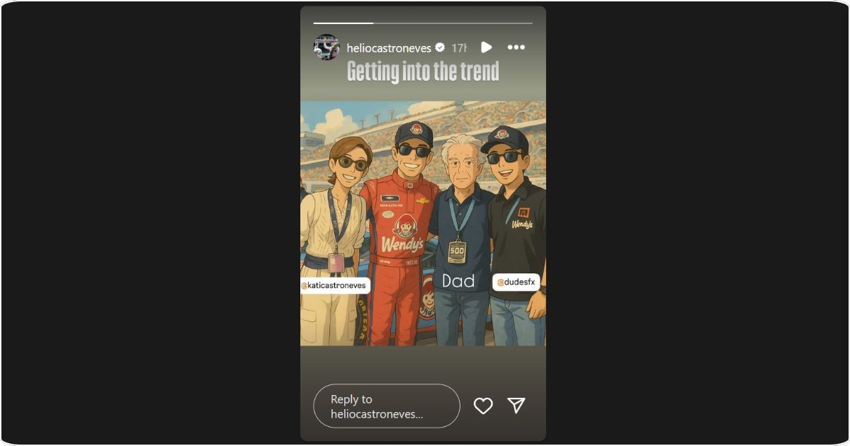 Helio Castroneves offered a four-word comment after recently jumping on the latest social media trend. The Brazilian motorsports icon hopped on the now-viral animation trend, sharing a Ghibli-style AI picture on his Instagram account.