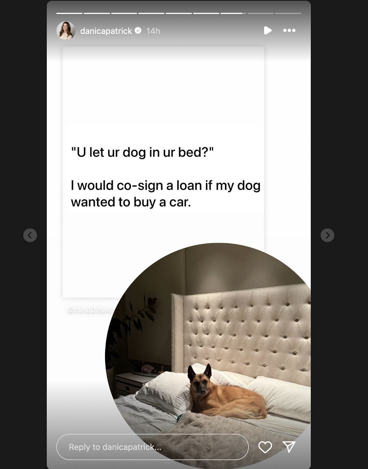Danica Patrick shared a funny meme about letting her dog on the bed, along with an adorable picture of her Belgian Shepherd, Ella. She also has another dog, a Husky named Dallas.