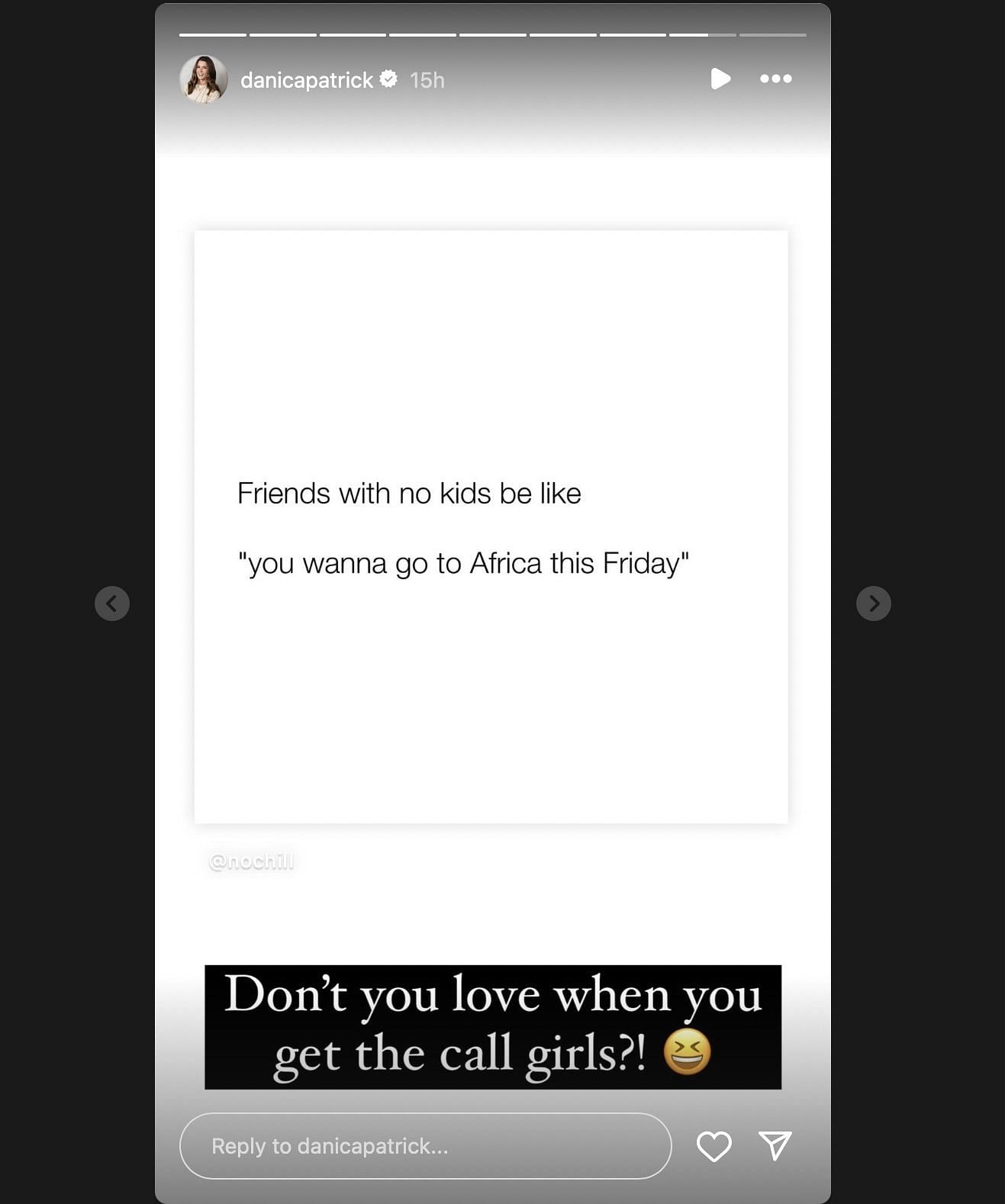 Danica Patrick also shared a meme about how randomly people 'with no kids' can make plans for a trip. While Patrick was married from 2005 to 2013, she does not have any children.