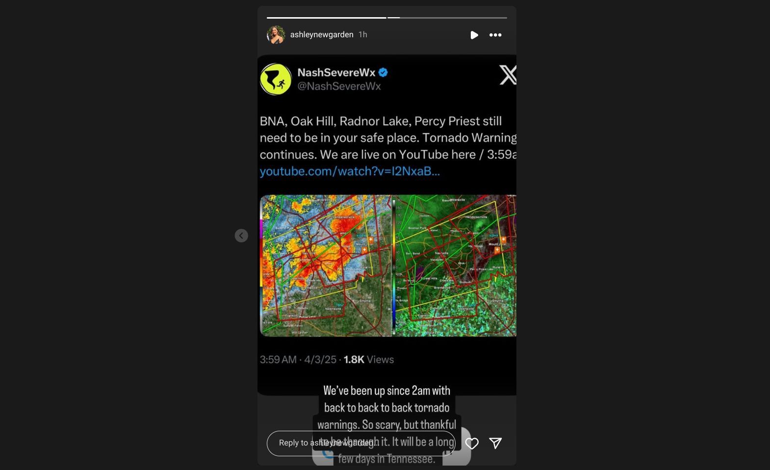 Josef Newgarden's wife Ashley shared an update on Instagram about the tornadoes in the Tennessee region as she uploaded a story on April 3, 2025. Ashley Newgarden shared a screenshot of a tweet uploaded by the @NashSevereWx account on social media platform X.