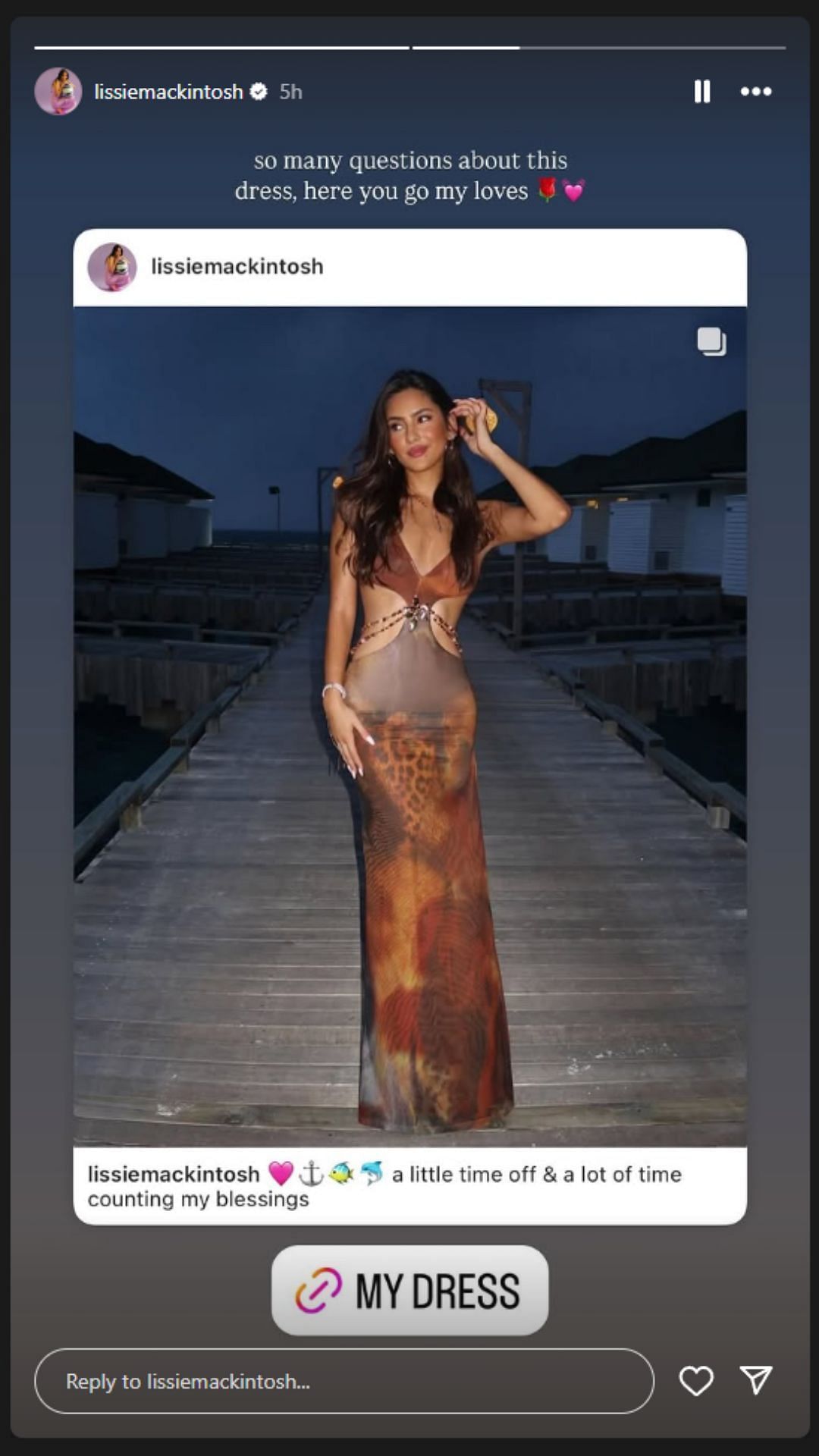 Marcus Armstrong's ex-girlfriend, Lissie Mackintosh, wowed in a backless Maxi dress she wore during her trip to Maldives. Mackintosh shared where she got the dress after her social media followers asked her about it.