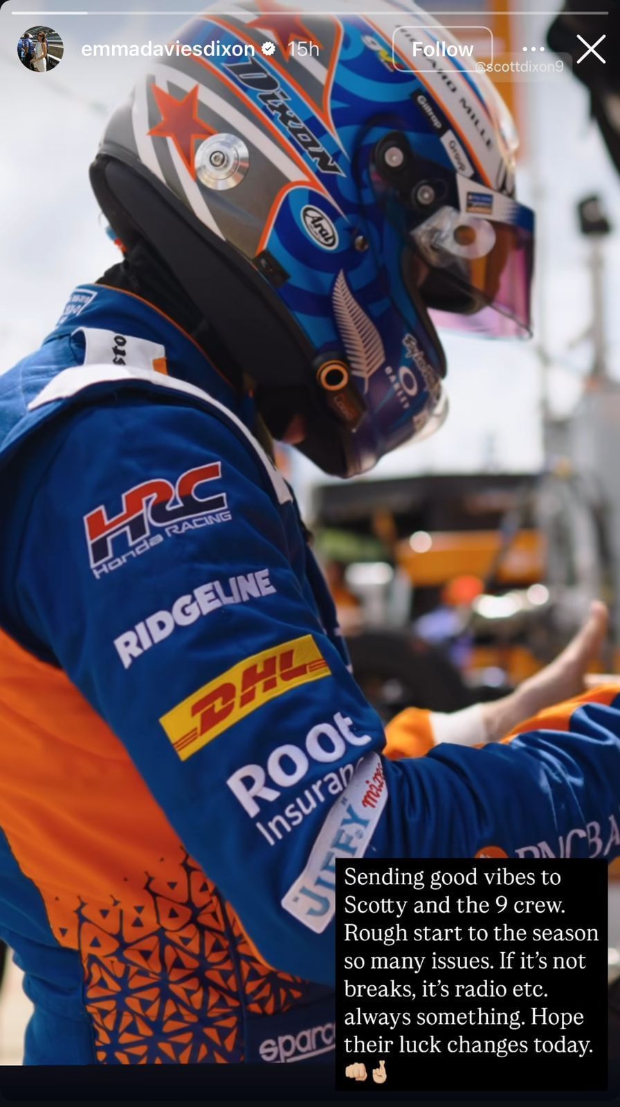 "Sending good vibes to Scotty and the 9 crew. Rough start to the season so many issues. If it's not breaks, it's radio etc., always something. Hope their luck changes today"