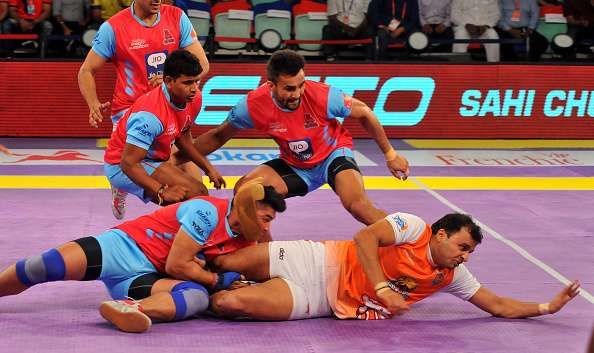 Every match is played for a minimum of 40 minutes which are divided into two halves of 20 minutes each. The teams can make changes to their 7 players on the mat during the half time break. The teams score points in the form of raids and defending – one player from a team is supposed to go to the opposition’s half chanting “Kabaddi, Kabaddi, Kabaddi..” until he can touch one opponent player or reach any of the two lines which are marked on the mat.