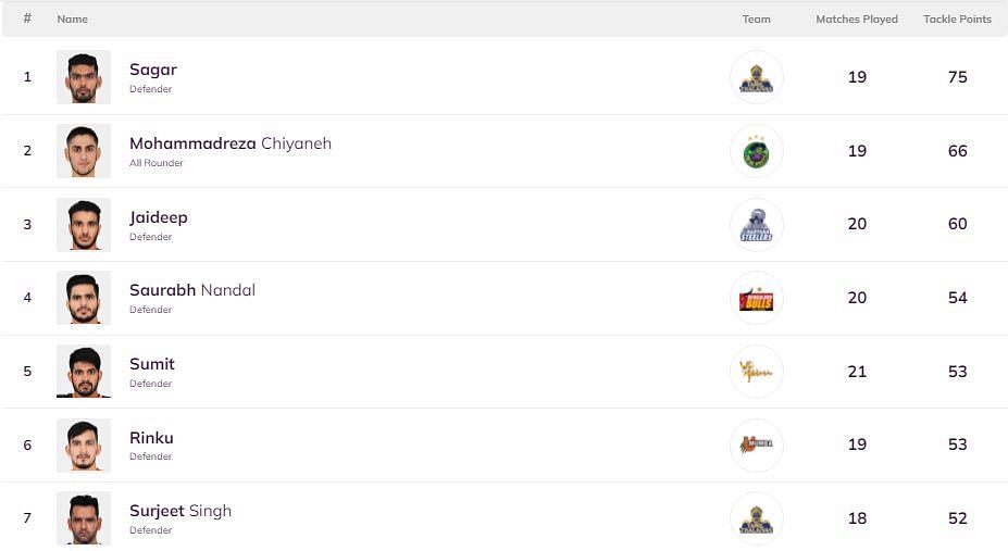 Sagar, Mohammadreza Chiyaneh and Jaideep firmly hold the top three positions. The gap between Chiyaneh and Sagar has now come down to just nine tackle points after the Patna Pirates star scored a High 5 against the Telugu Titans.