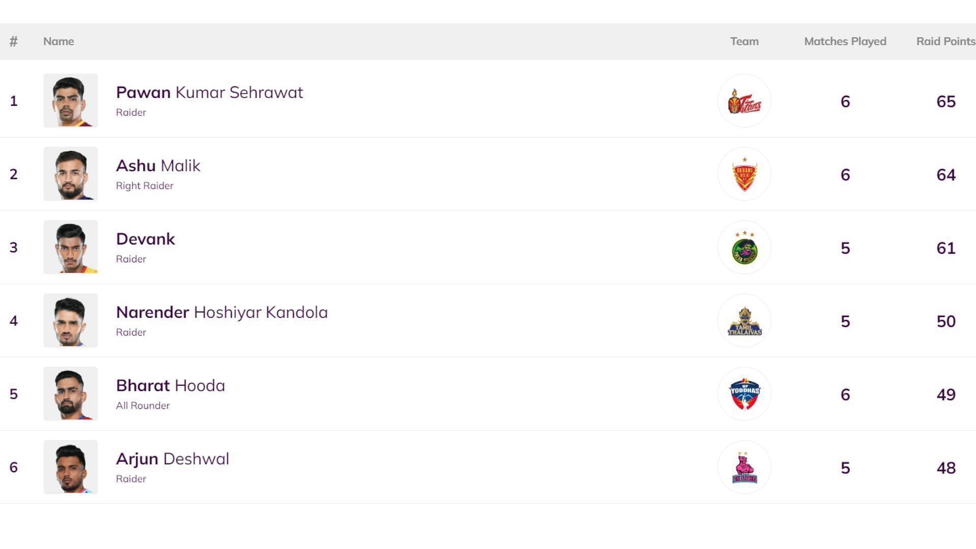 Meanwhile, rising star Devank is making waves this season with an impressive 61 raid points from five matches. Following him is Narender Kandola with 50 raid points in five games, whose controlled aggression has been effective for the Thalaivas. Other top raiders include Bharat Hooda (49 points in six games) and Arjun Deshwal (48 points in five games).