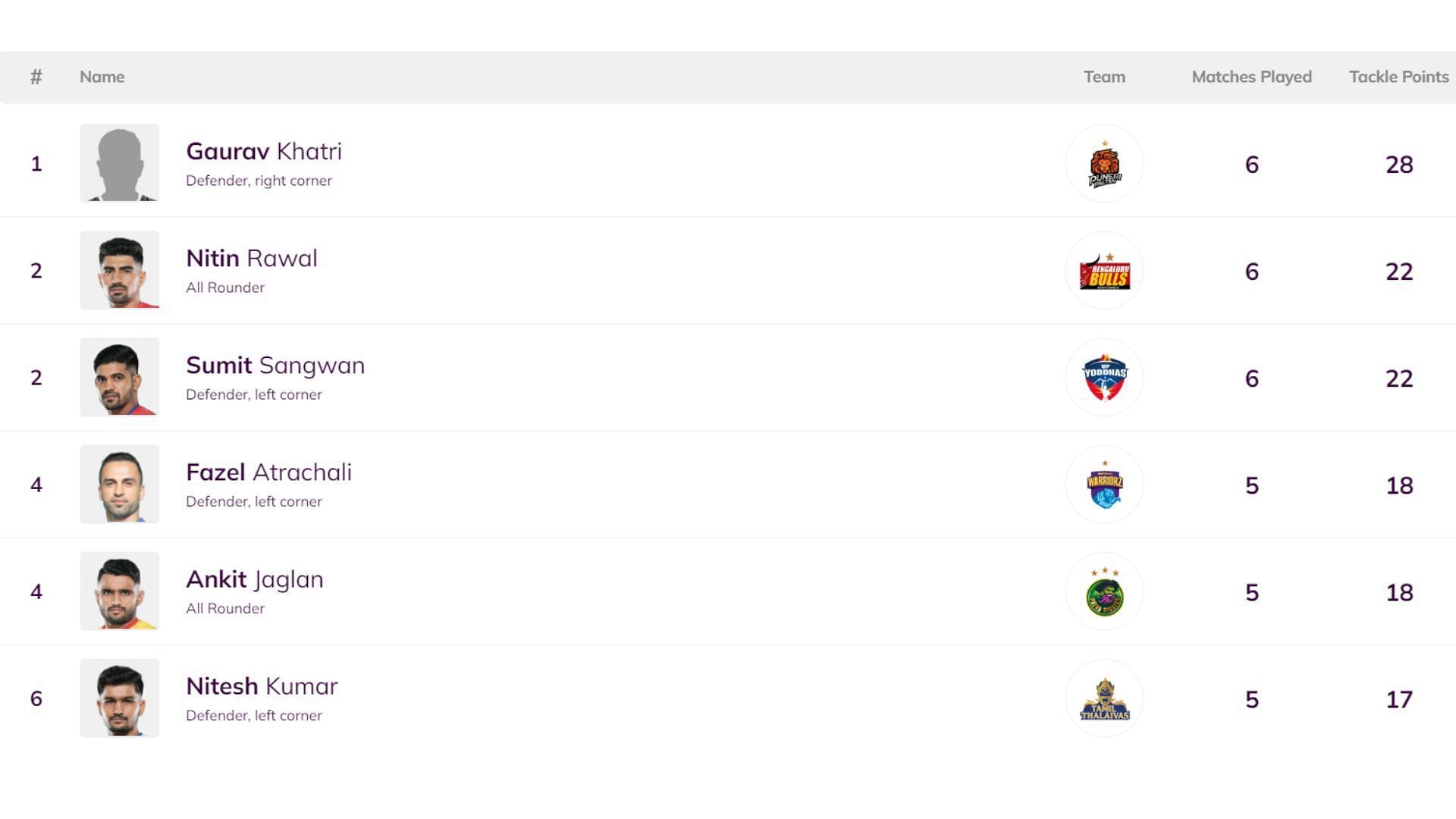 Meanwhile, Nitesh Kumar and Sahil Gulia from Tamil Thalaivas hold the sixth spot with 17 tackle points in five games each.