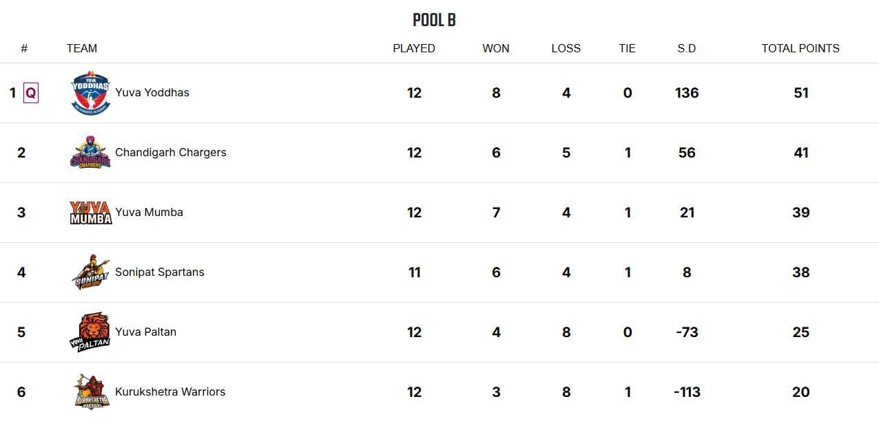 The Pool B standings are as follows with Yuva Yoddhas winning their eighth game of the season against Sonipat Spartans by 34 points, with 51 points from 12 games at a difference of 136. Chandigarh Chargers defeated Yuva Mumba by five points to fill in the second position with 41 points from 12 games at a difference of 56. They have won six games, lost five, and one ending in a tie.