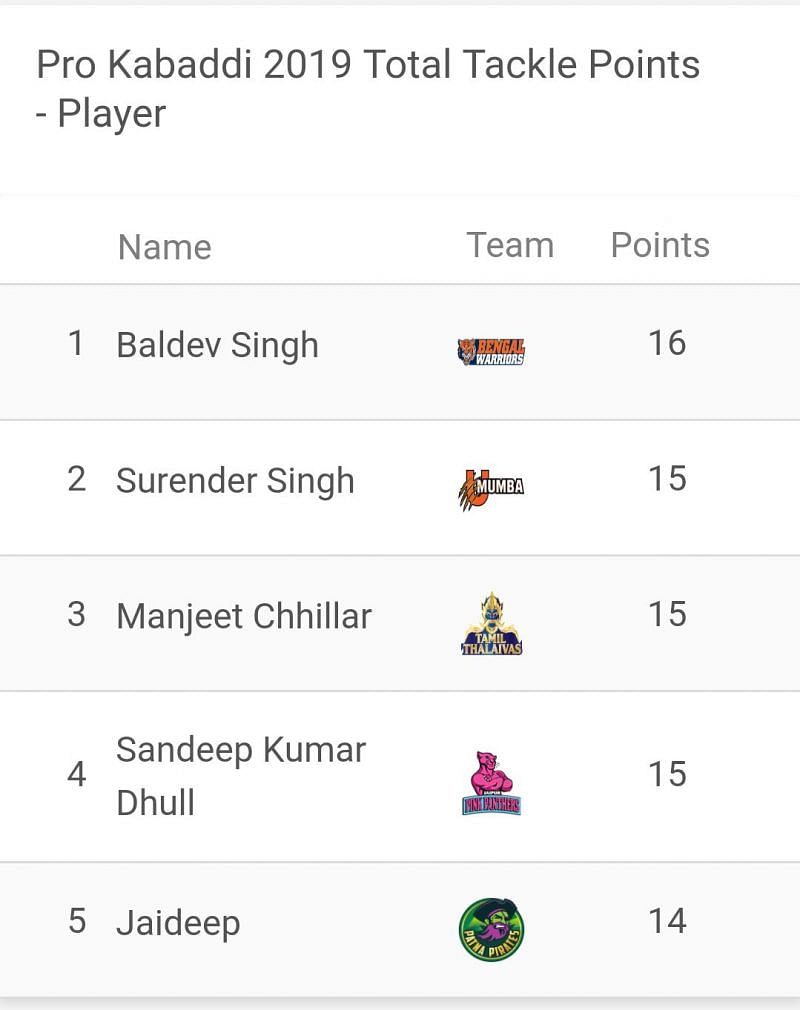 Although known for his skill as a raider, GB More emerged as the best defender of the match between Gujarat and Delhi, apart from which there were no changes in the 'Most Tackle Points' list. Bengal Warriors' lion Baldev Singh is placed at the top followed by Surinder Singh and Manjeet Chhillar, respectively.