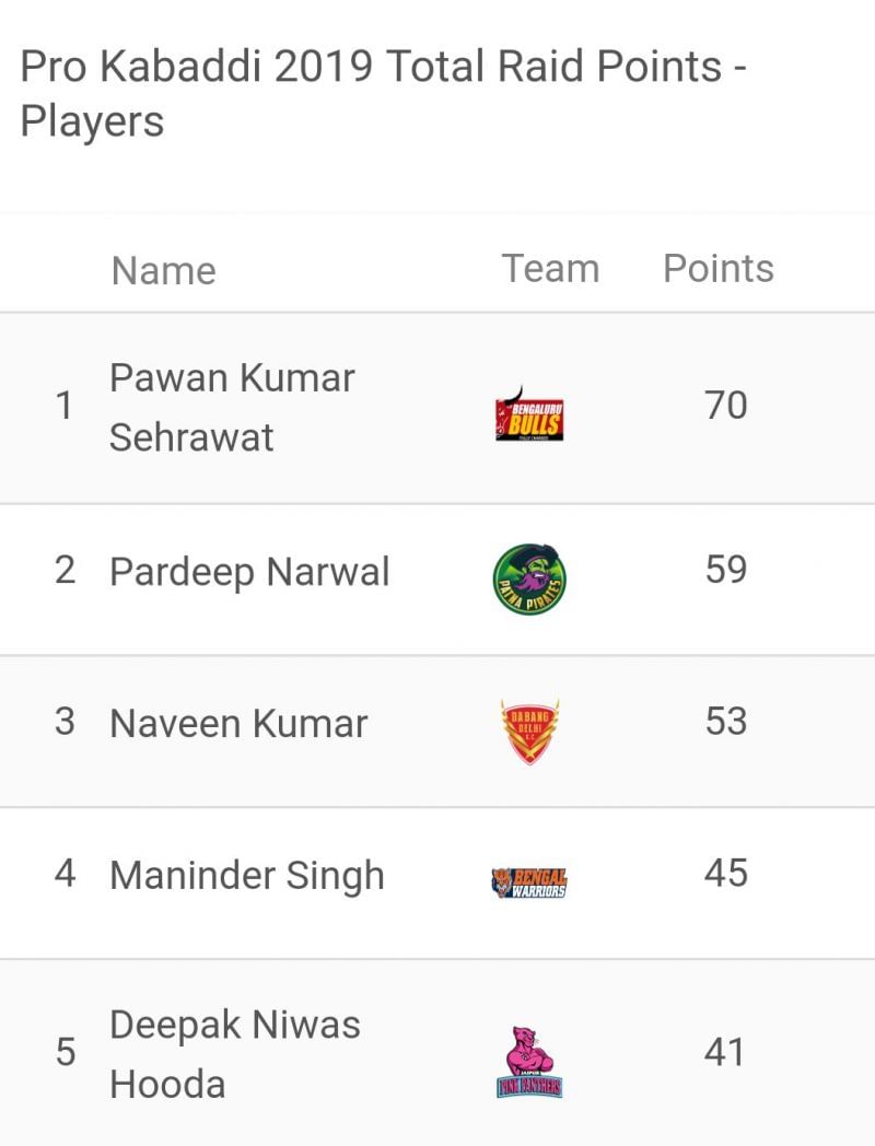 Pawan Sehrawat is dominating the raiders' leader-board with 70 raid points to his name. Pardeep Narwal and Naveen Kumar are the other two raiders who have crossed the 50 raid points milestone this year. The captains of Bengal Warriors and Jaipur Pink Panthers, Maninder Singh and Deepak Niwas Hooda are at number 4 and number 5, respectively.