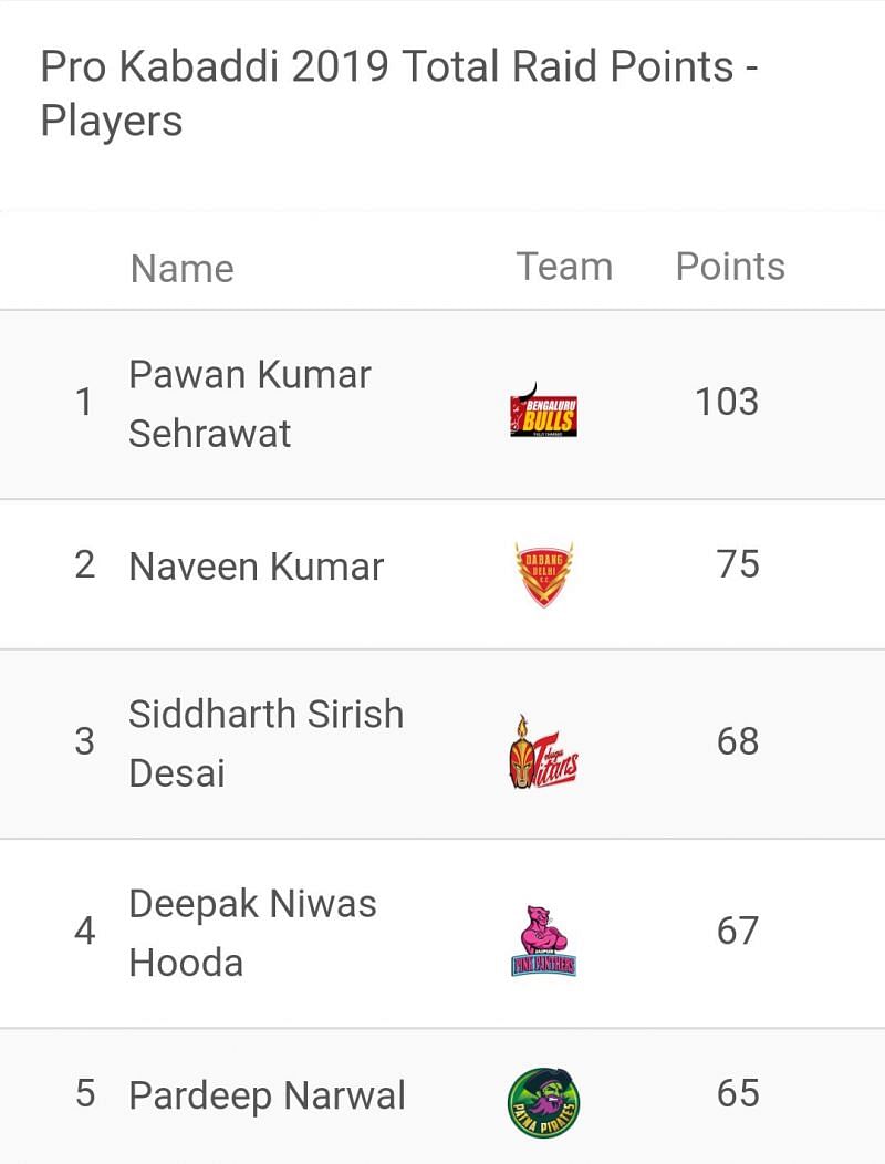 Though Pawan Sehrawat was not at his best last night, he managed to cross the milestone of 100 raid points this season thanks to his 5 raid points versus Puneri Paltan. Also, Deepak Niwas Hooda has taken the 4th position courtesy his 3 raid points.