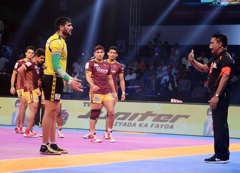 As the match was intensifying, the chirping on the mat also reached unbearable levels for the referees who finally decided enough was enough. Defender Vishal Bhardwaj was shown a green card to begin a forgettable passage of play for the Titans. Rahul Chaudhari started off by playing the 'sensible captain' and seemed to be advising the young defender to move on with the game.