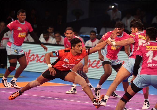 He may have donned the yellow and green jersey of the Patna Pirates but the star raider would have the feel of playing at home given the fact that he's grown up playing kabaddi on the mud grounds of Sonepat itself. He was rampant on the mat and notched up yet another inning of 21 raid points, this time against U Mumba in a losing cause.