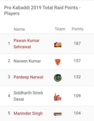 Here's the list of the raiders with the most raid points in Pro Kabaddi 2019, followed by the 'Most Tackle Points' updated as on 7th September 2019.