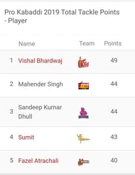 Just like the list of raiders, there is no change in the defenders' leader-board as well. Vishal Bhardwaj, Mahender Singh, Sandeep Kumar Dhull, Sumit and Fazel Atrachali continue to be the top defenders of this season.