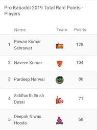 Pawan Kumar Sehrawat and Naveen Kumar are leading the race with 128 and 104 raid points respectively. Deepak Niwas Hooda has managed to hold the 5th spot while Pardeep Narwal and Siddharth Desai are at the 3rd and 4th positions.