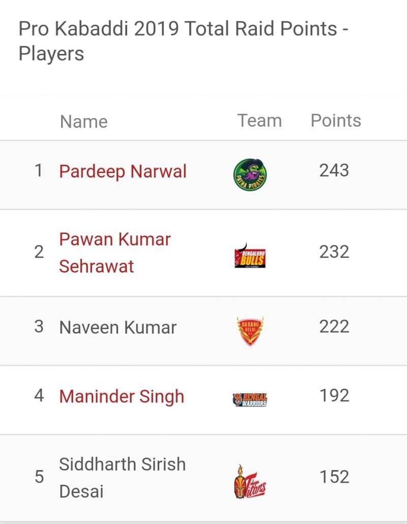 Pardeep Narwal has reached the pinnacle of the raid points list with 243 raid points. Pawan Sehrawat is at the 2nd spot with Naveen Kumar just 10 points behind him. Maninder Singh and Siddharth Desai are the other raiders in the top 5.