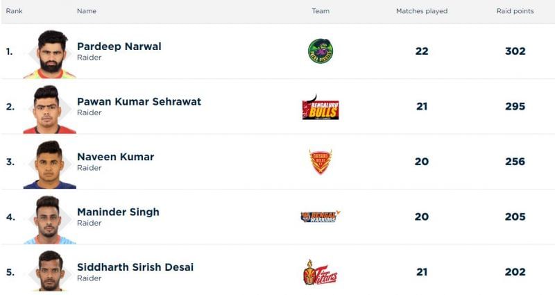 There were no changes in the list of the Top 5 raiders of the season, but Siddharth Desai crossed the 200 raid point mark, courtesy of his Super 10 against the Gujarat Fortune Giants. Pardeep Narwal continued to lead the charts while Pawan Sehrawat, Naveen Kumar and Maninder Singh held on to their position on the list.