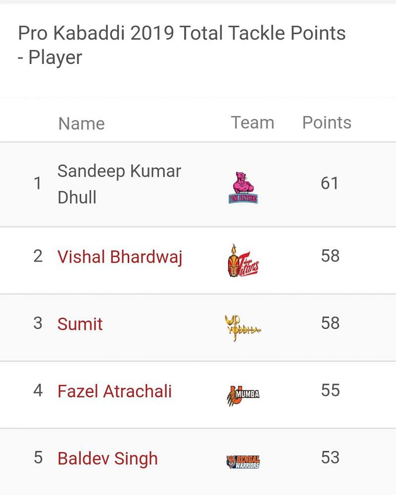 Sandeep Kumar Dhull continued his hold on the top spot with 61 tackle points to his name but could be in for a shift in position with Vishal Bhardwaj and Sumit having registered 58 points to their name and putting up good performances regularly. Fazel Atrachali has led from the front for U Mumba and has 55 points to take up 4th place while Bengal Warriors' Baldev Singh is on 5th place with 53 tackle points.