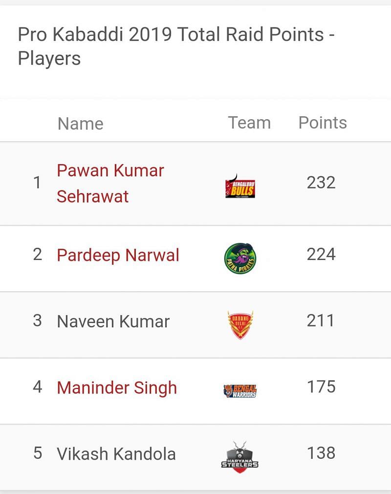 Pawan Sehrawat continued his lead at the top of the list with 232 raid points while Pardeep Narwal reduced the gap between himself and Pawan to just 8 points. Naveen Kumar's Super 10 saw him hold on to the 3rd position with 211 raid points while Maninder Singh and Vikas Kandola's fine show sees them on the 4th and 5th spot respectively.