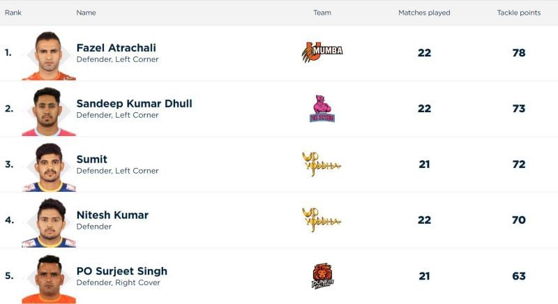 Fazel Atrachali has become the top defender of Pro Kabaddi 2019 with 78 tackle points in 22 matches. Sandeep Dhull is in the 2nd spot of the 'Most Tackle Points' list while Sumit and Nitesh Kumar are at the third and fourth positions respectively. Also, Surjeet Singh holds the fifth rank.