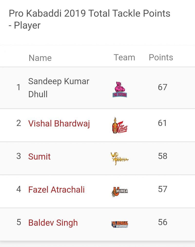 Sandeep Dhull has consolidated his position at the top with 67 tackle points but with U.P. Yoddha's home leg coming soon, expect the third-placed Sumit to take the top spot soon. Fazel Atrachali, Baldev Singh and Vishal Bhardwaj are the other three defenders in the top 5.