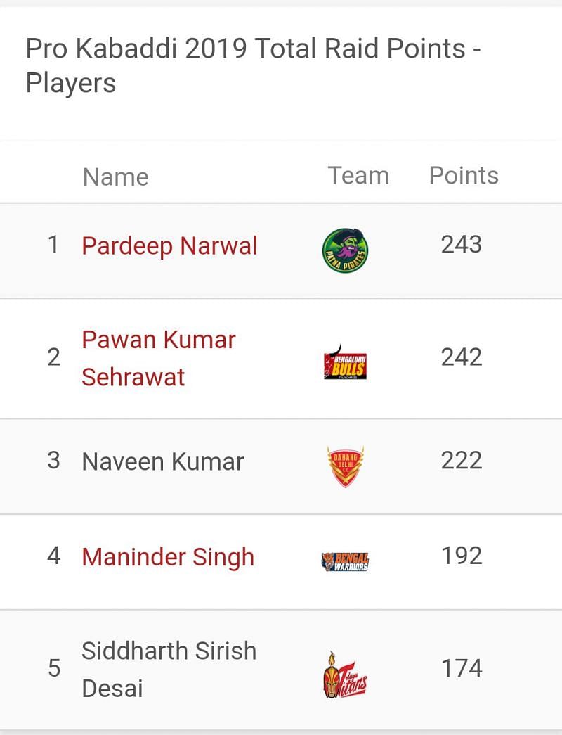 Pardeep Narwal has replaced Pawan Sehrawat as the number 1 raider of the tournament but the difference between the two players is only of one point now. Naveen Kumar too is inching closer while Maninder Singh and Siddharth Desai will definitely cross the milestone of 200 raid points soon.