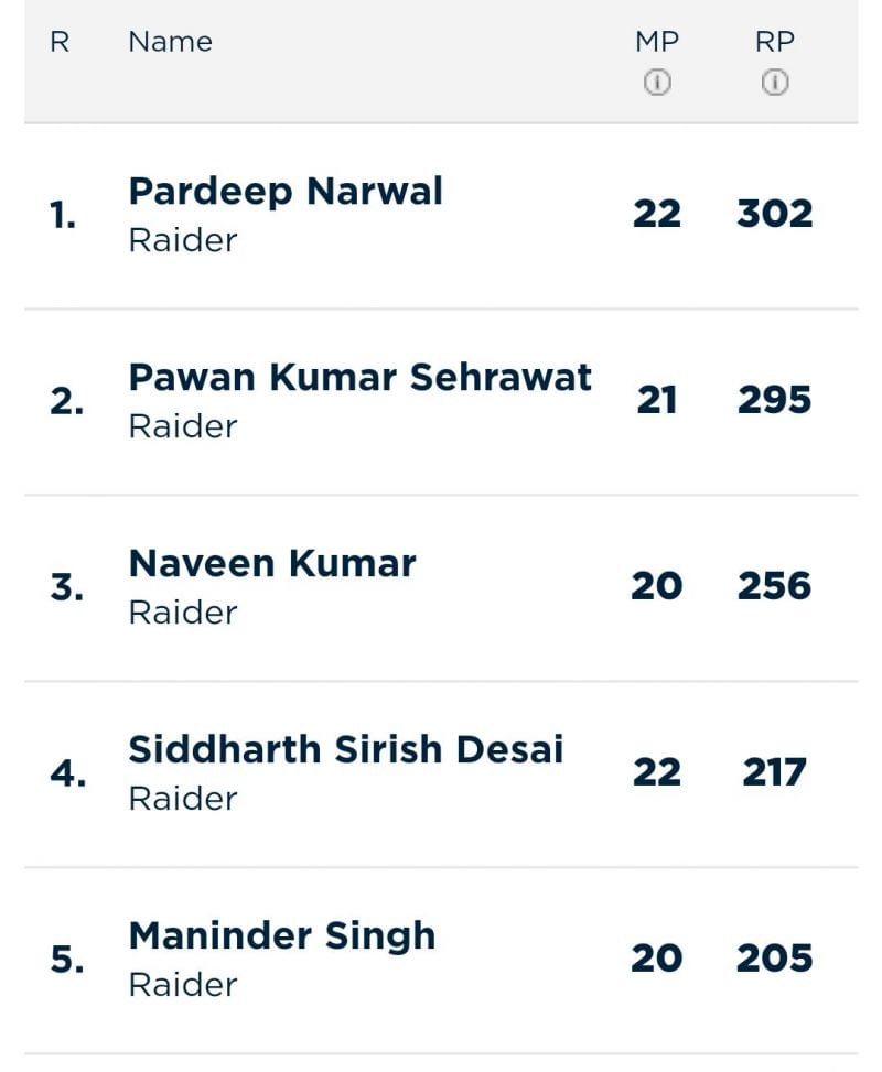 There are zero changes in the raiders' leaderboard as Pardeep Narwal, Pawan Sehrawat and Naveen Kumar are the top three raiders of Pro Kabaddi 2019, followed by Siddharth Sirish Desai and Maninder Singh at number 4 and number 5 positions respectively.