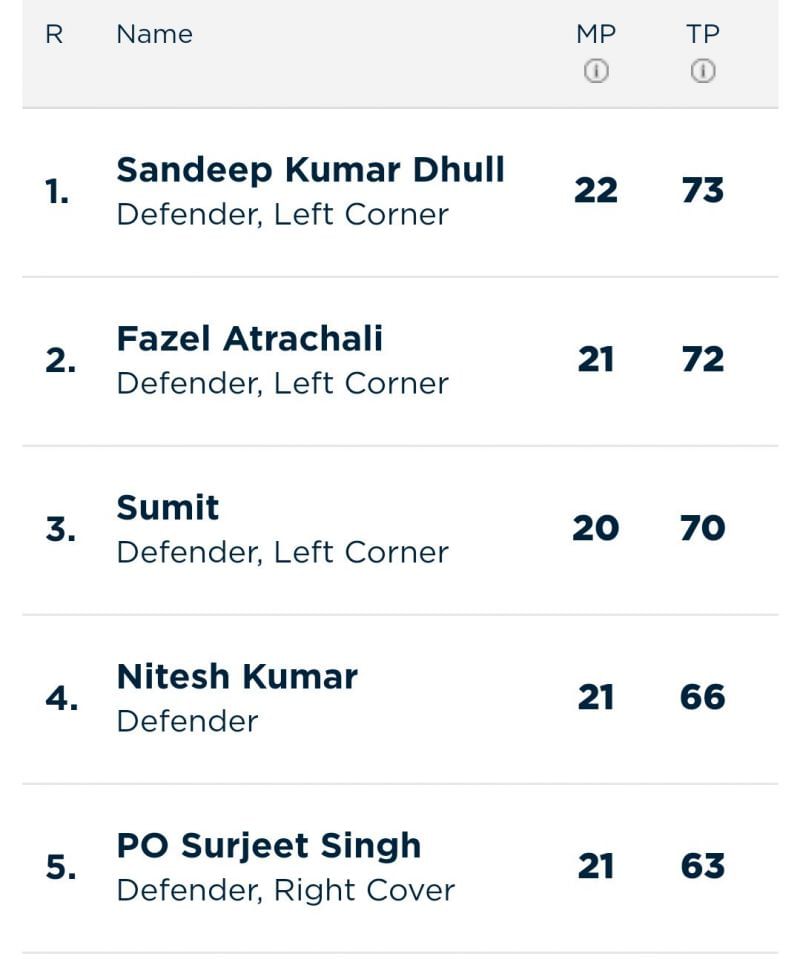 Fazel Atrachali's eight tackle points have taken him to the second spot on the defenders' leaderboard and he is now just one point away from the top defender of the league, Sandeep Dhull. Sumit, Nitesh Kumar and Surjeet Singh are the other three defenders in the top five.