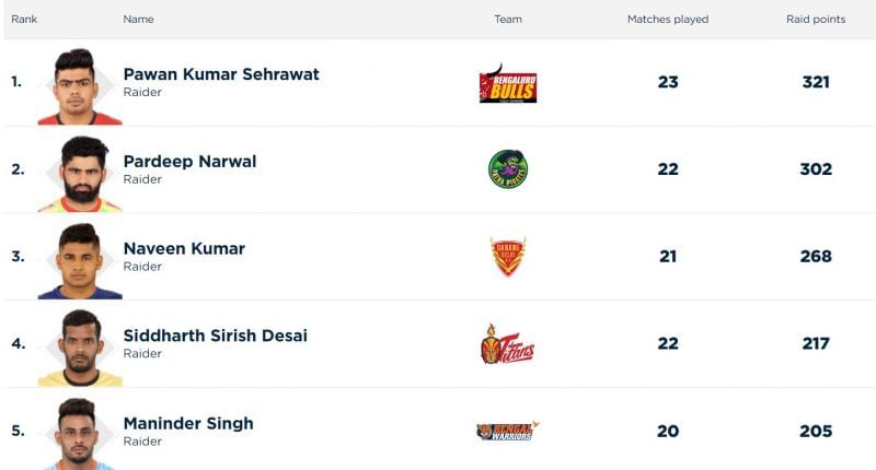 Pawan Sehrawat has cemented his position as the top raider of Pro Kabaddi 2019 with 321 raid points while Pardeep Narwal and Naveen Kumar are the other raiders in the top 3. Siddharth Desai and Maninder Singh continue to be at the fourth and fifth positions respectively.