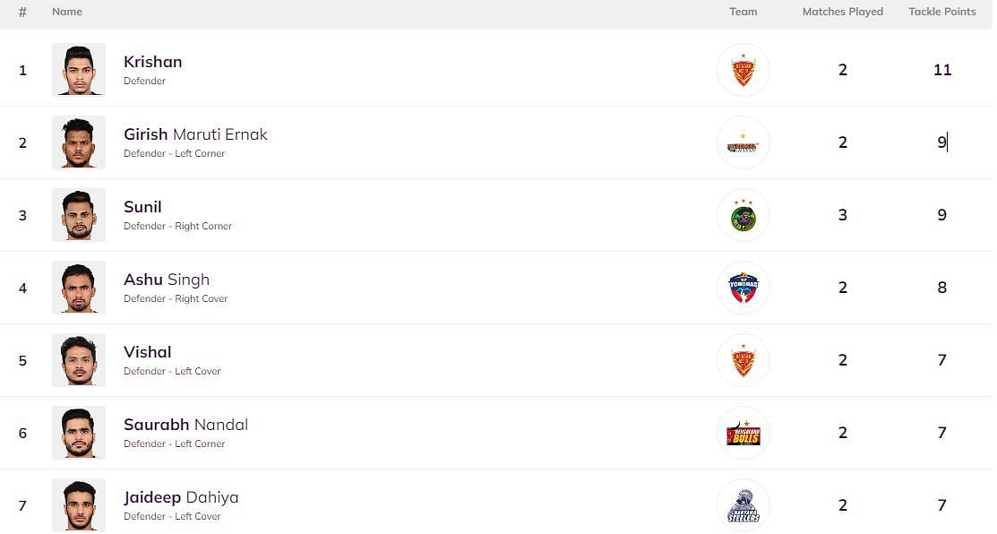 Krishan and Girish Ernak retained the top two spots on the Most Tackle Points list. Patna Pirates' right corner defender Sunil has moved up to third position after scoring four tackle points against the Telugu Titans. He now has nine tackle points to his name.