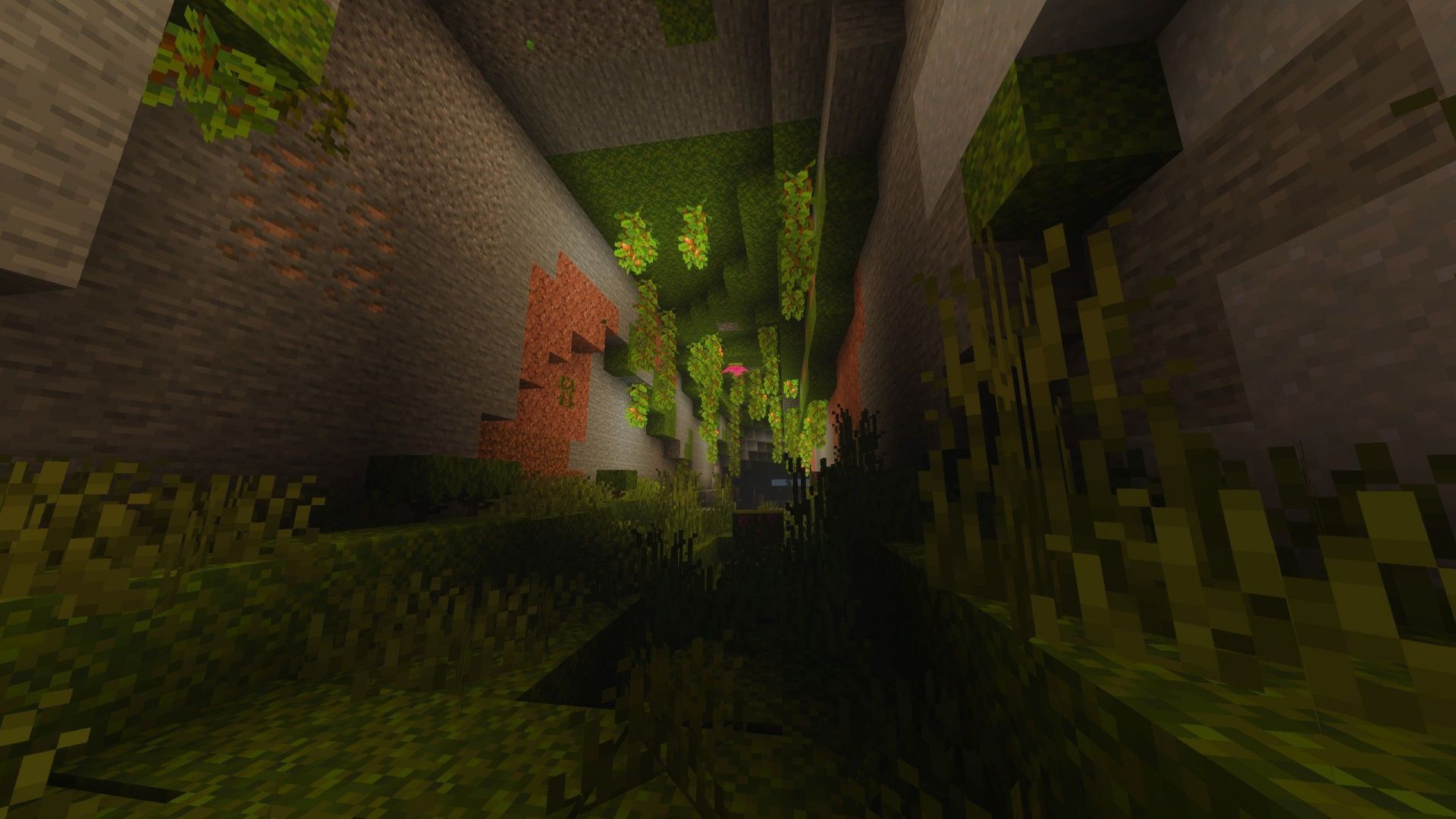 Since Vibrant Visuals enhances the lighting and reflections, this biome can be stunning with the new visual upgrade. The glow berries can illuminate the space and create some interesting shadows in the caves, while some lights can be reflected from the water puddles as well. Lastly, Lush Caves will also have a unique green particle effect that surrounds the area.