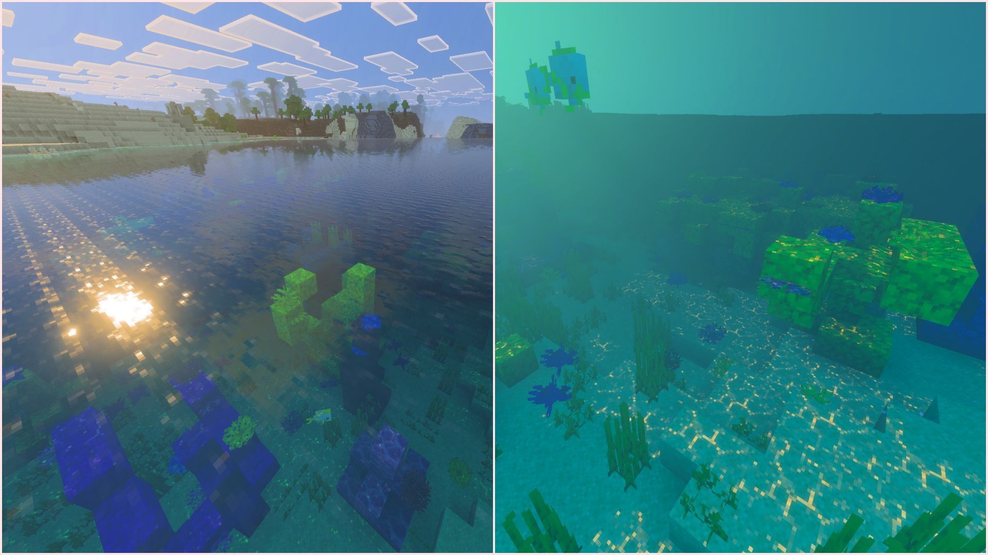The Warm Ocean looks stunning because players can see reflections of the sun along with coral reef blocks. They can also dive deep and get a close-up of the reefs.