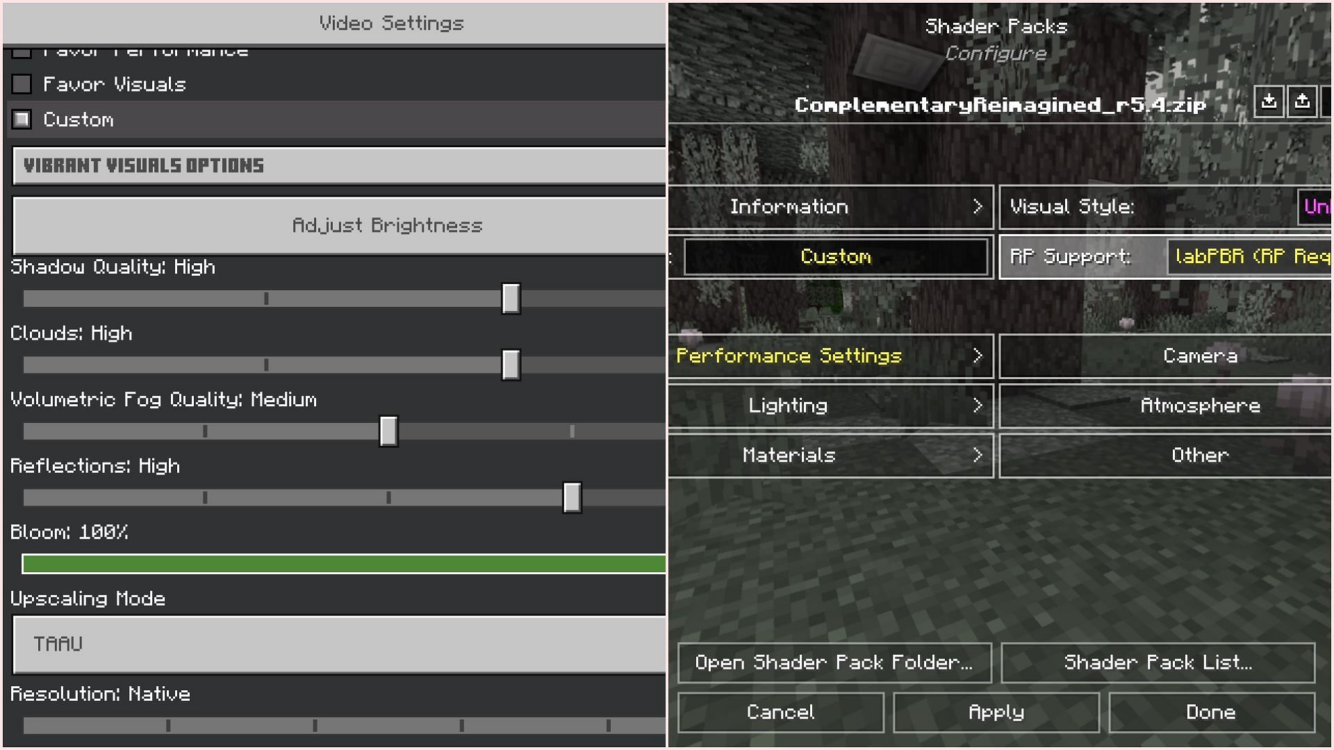Vibrant Visuals offer shadow quality, clouds quality, volumetric fog quality, reflections quality, bloom, and upscaling method settings in Bedrock Edition. Furthermore, other third-party shader packs have even less settings than Vibrant Visuals.