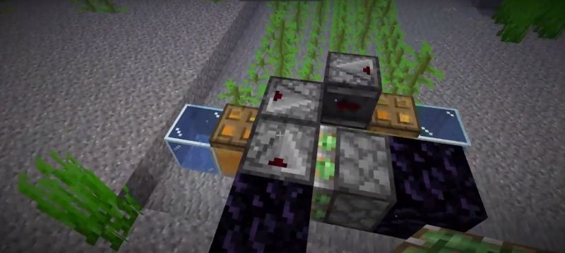 The specific fly contraption design seen above is the design that will be focused on in this article. This contraption is used to farm kelp while completely submerged underwater. This is useful for players looking to create things such as automatic kelp farms, turtle farms, etc.