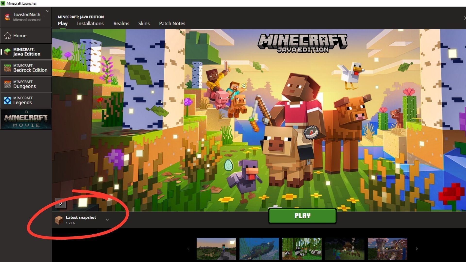 - Select the "Latest Release" option and make sure it shows 1.21.6. Next, click on the green Play button to begin the download.