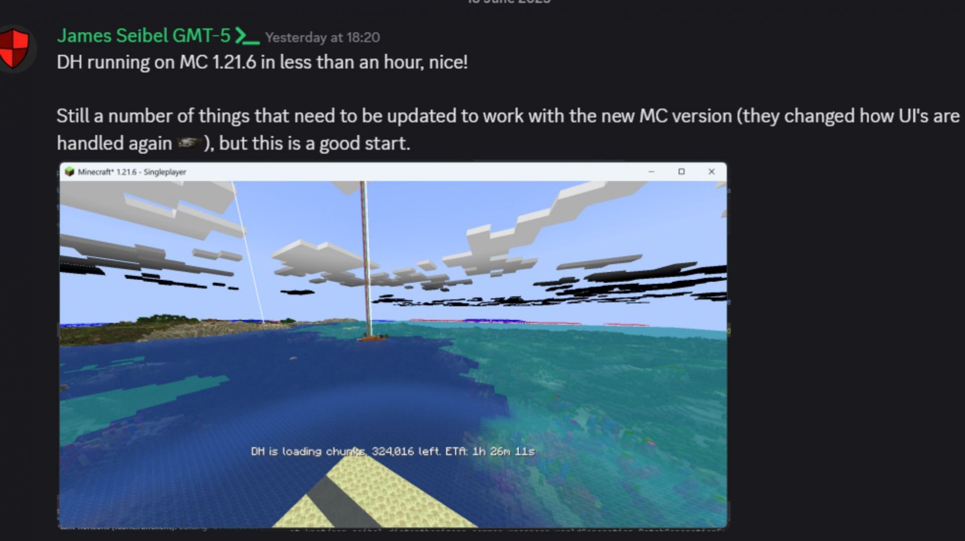 Since Distant Horizons is so popular, they have a dedicated Discord server where players can learn the latest news and development progress of the mod. In the developer's chat, the creator of Distant Horizon, James Seibel, posted a screenshot on June 18, 2025, that the beta mod was already working with Minecraft 1.21.6.