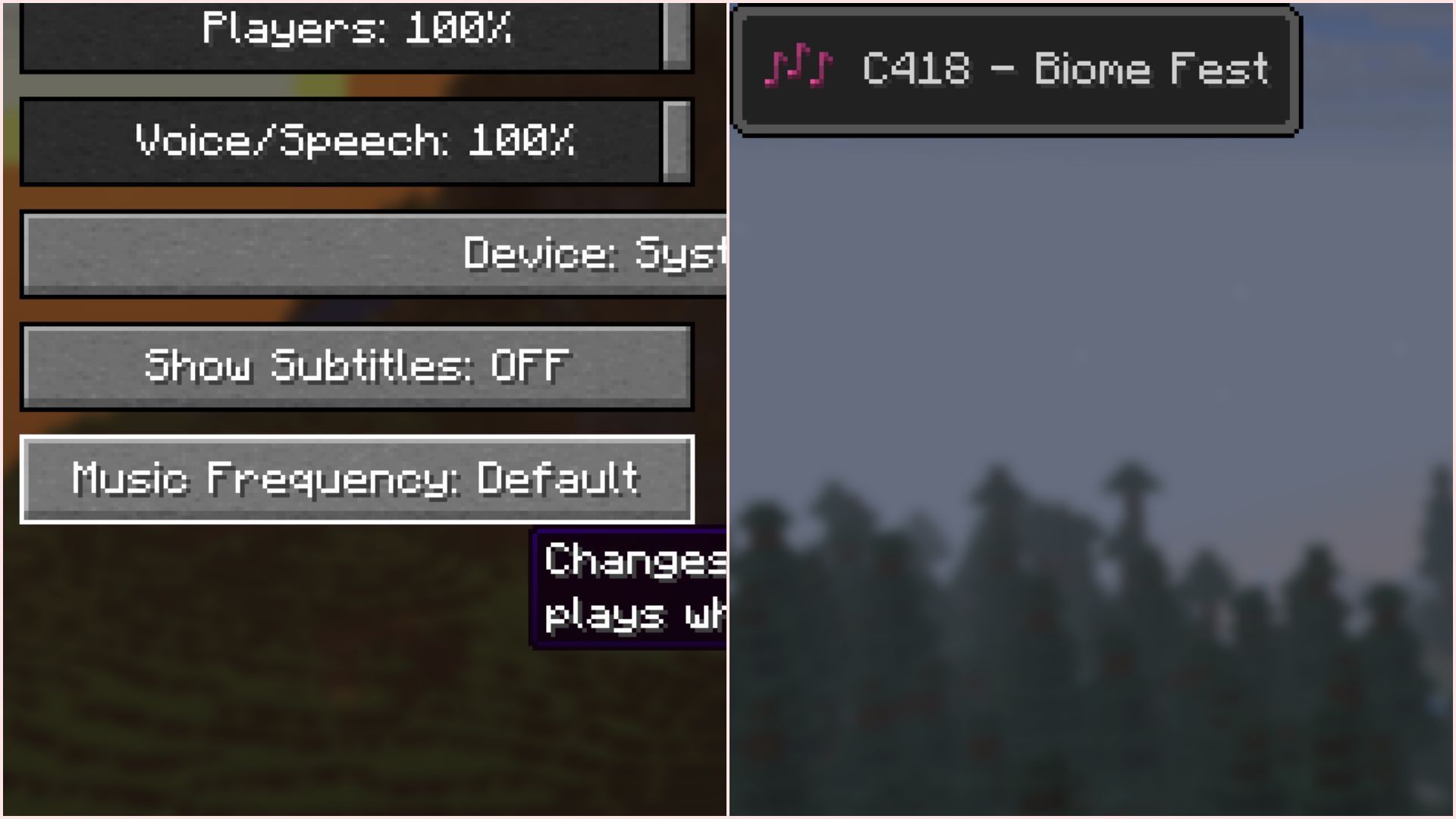 The first setting is called music frequency, which will allow players to change the frequency at which in-game background music is played. The default is the old vanilla frequency, which means the music will stop at times and not come back for several minutes or hours. While the "frequent" and "constant" settings will progressively increase the music's frequency.