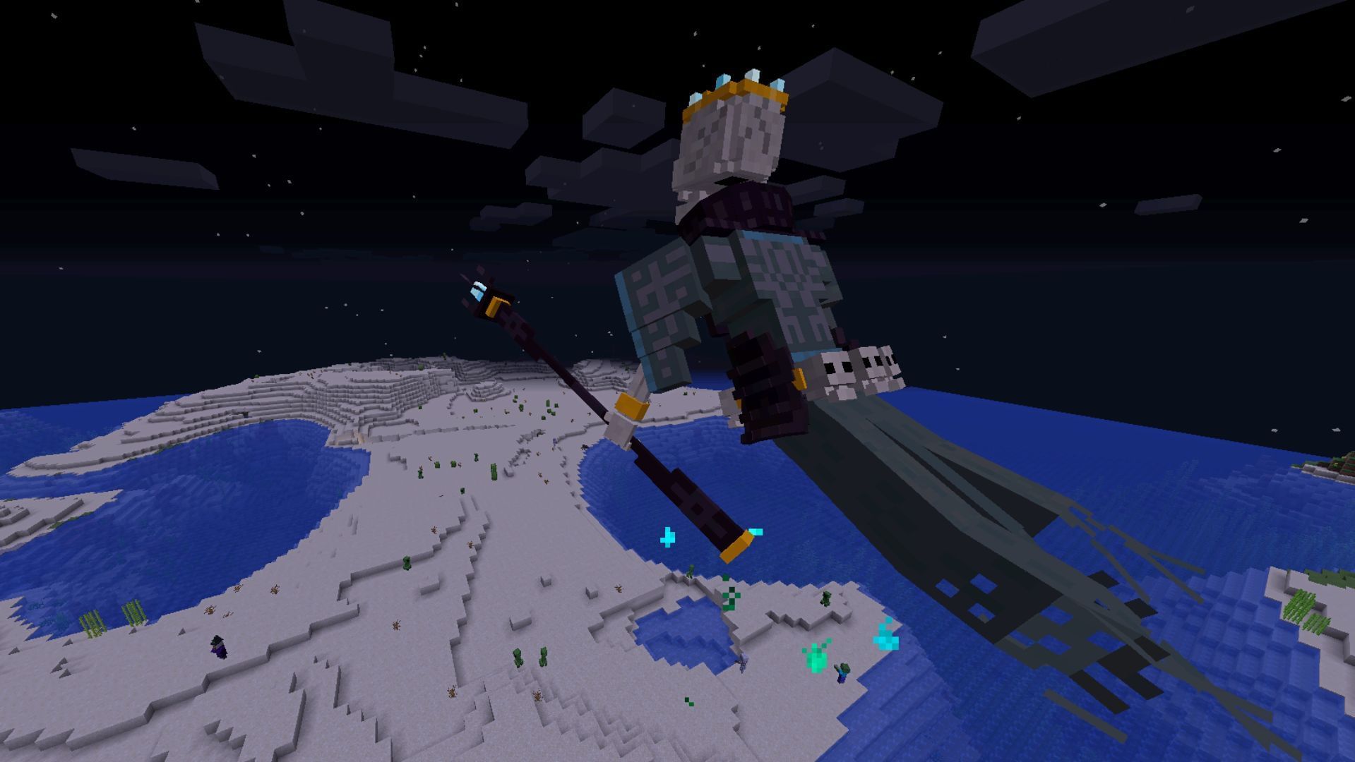 Night Lich can be found in new rare tower structures in cold biomes that can be found by following soul stars that are dropped by undead mobs. When these soul stars are obtained, they can be thrown as eyes of ender to find the structure. The Night Lich spawns and instantly starts throwing deadly magical balls towards players. It can also shoot lasers and spawn phantoms. After defeat, it can drop various enchanted books and also new items like Ancient Anima.