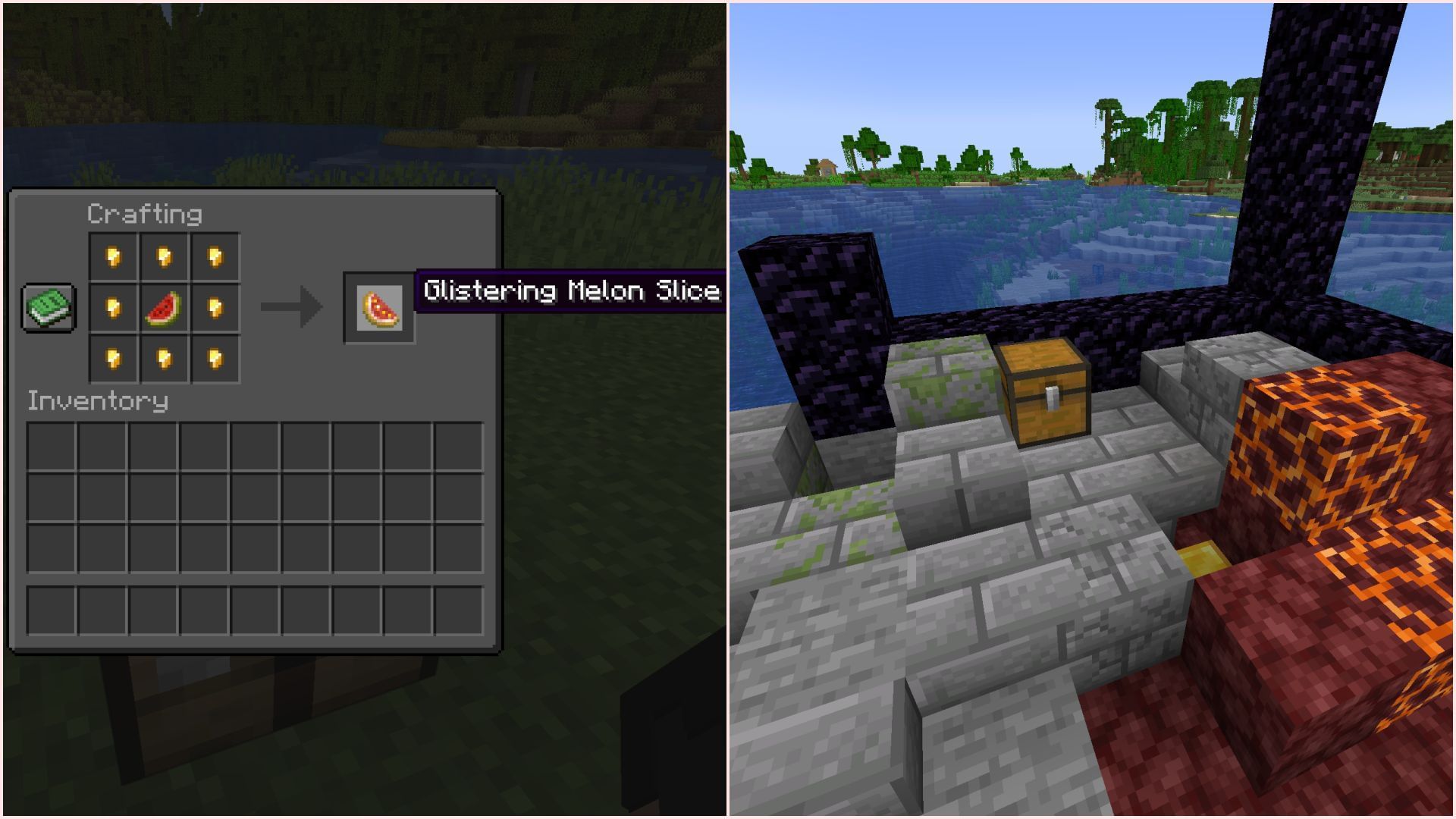 Gold nuggets can be obtained by dismantling gold ingots, killing zombified piglins, smelting gold gears, mining Nether gold blocks, etc. A melon slice can be obtained by harvesting naturally generated or player-grown melons.