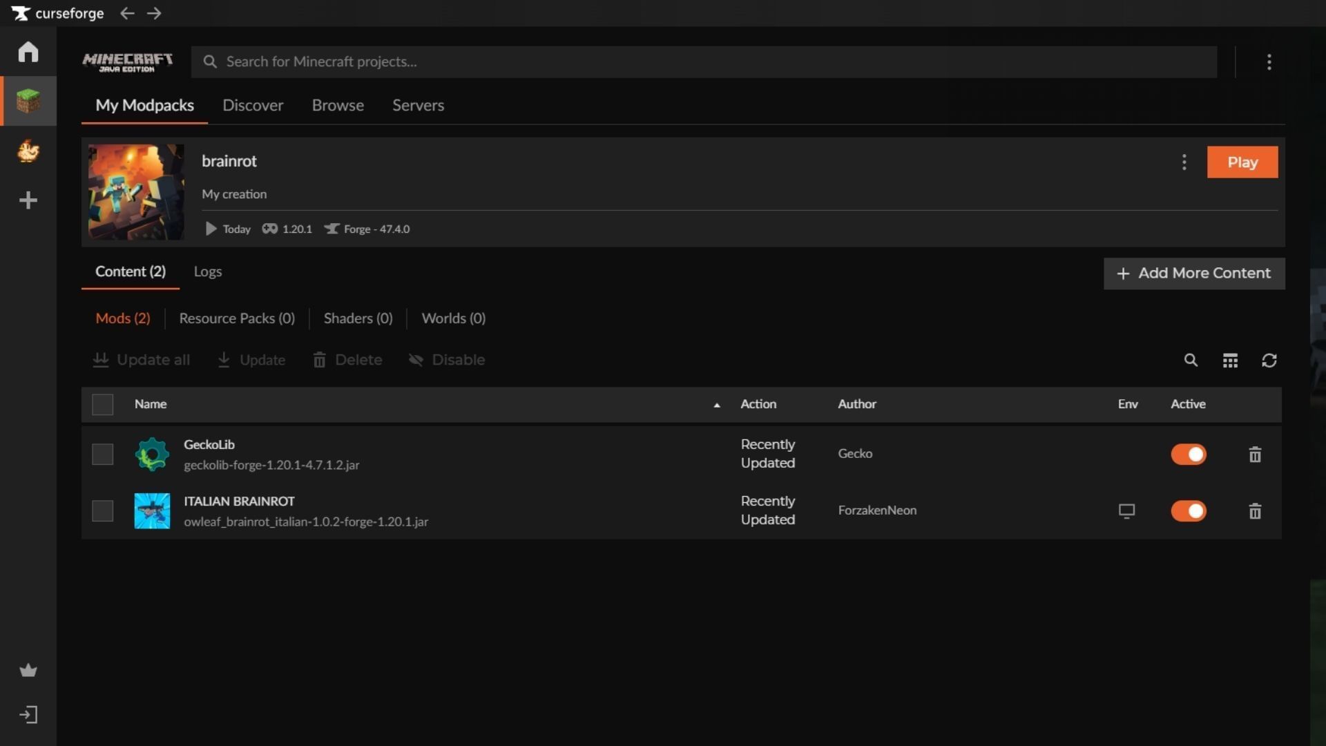 - If you wish to install the ITALIAN BRAINROT mod manually, just click on the black Download button located on the right side of the screen. Once the ZIP file has been downloaded, place it in the mods folder of your instance's mod directory. However, if you do not have Minecraft with Forge installed or you are new to installing mods and packs, using the Curseforge mod loader is recommended to make the installation process easier.
