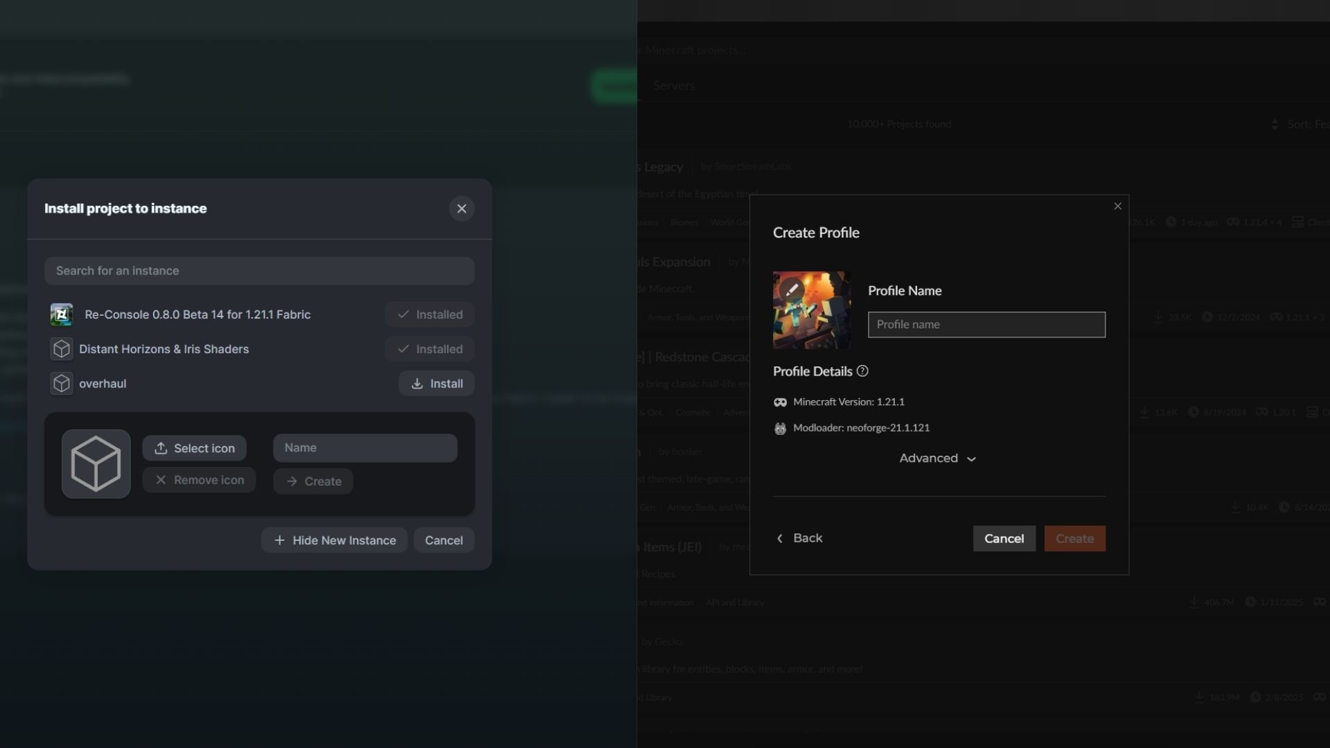 - Once the application loads, you will be prompted to create a new instance (installation) or choose an existing instance of Minecraft to install the desired mod. While you can choose an existing instance, it is recommended that you install the mod on a fresh one. This essentially prevents any conflicts with existing mods, shaders, or data packs and avoids unexpected world corruption.