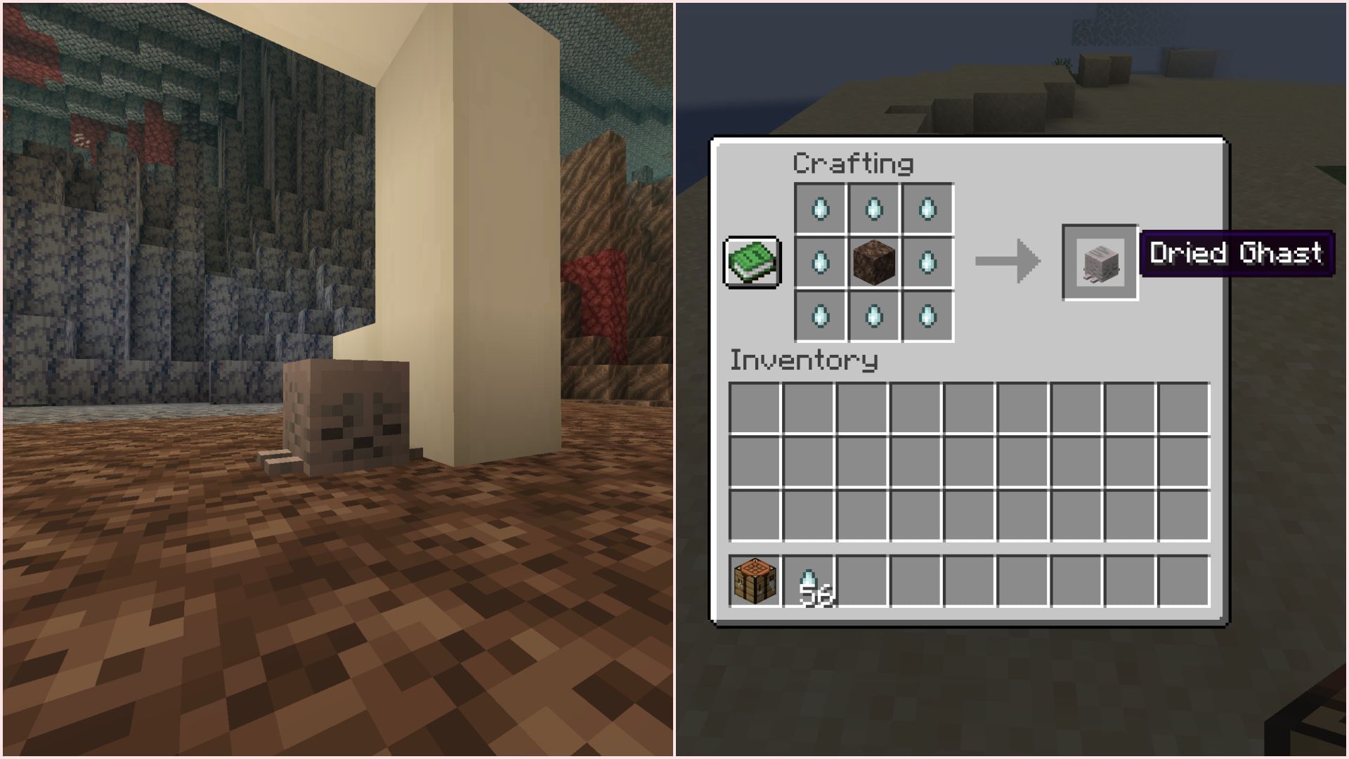 Dried ghast is a new block that was released with the Minecraft Chase the Skies update. It naturally generates near Soul Sand Valley fossils and can also be crafted using eight ghast tears and one soul sand block.
