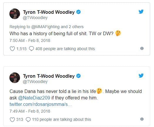 UFC was all buzzing with the Nate Diaz tweet that he wants to return to UFC if it's the right fight. Several UFC fighters have replied and the list includes former champion Eddie Alvarez, Kevin Lee with the latest to enter the mix being the current welterweight champion, Tyron Woodley. Both Nate and Tyron have publicly spoken that this could be a potential 170 lb clash possibly scheduled for UFC 226.