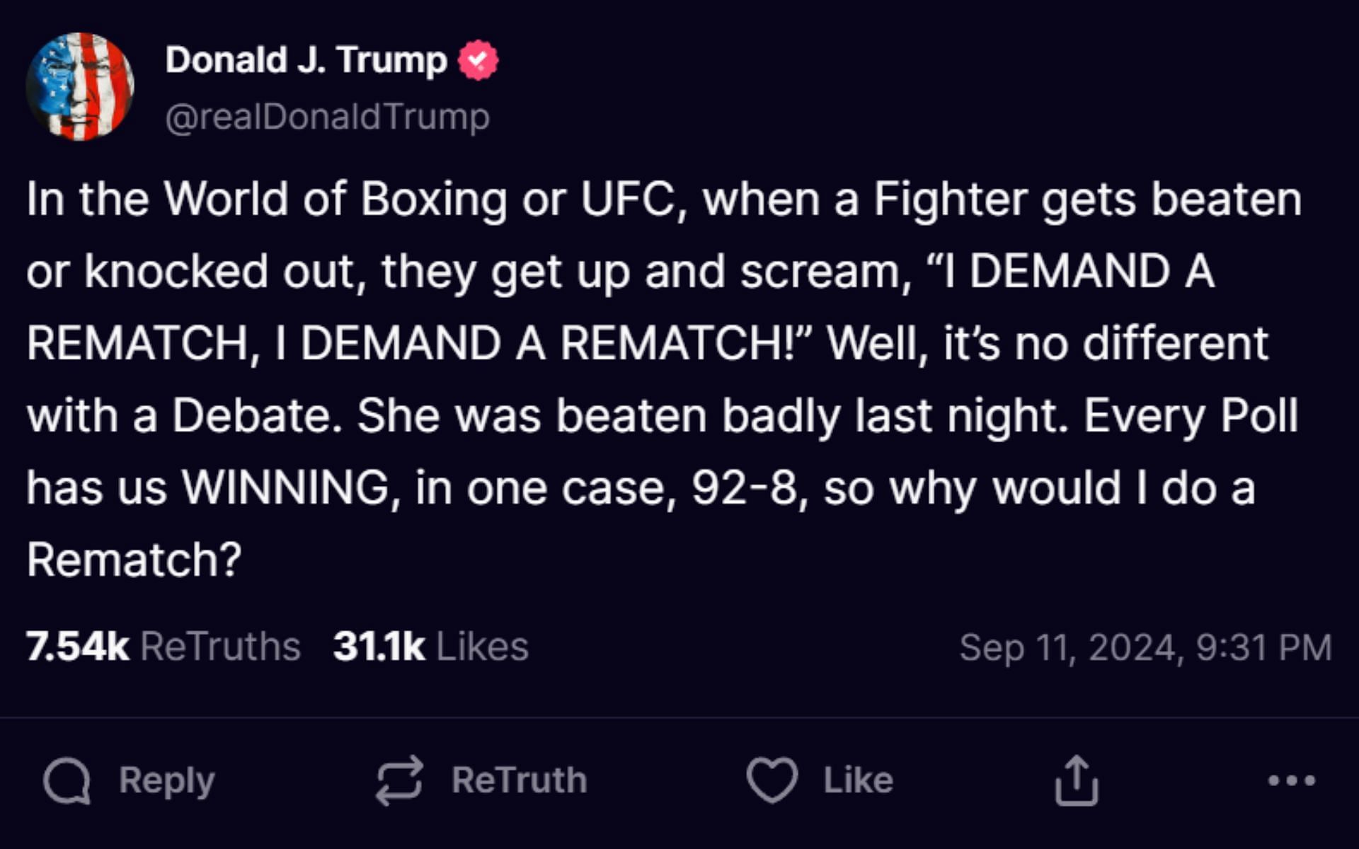 Donald Trump refused to take part in a second debate with Kamala Harris ahead of November's presidential elections. To make his point, the ardent MMA fan used an example from the world of MMA and boxing.