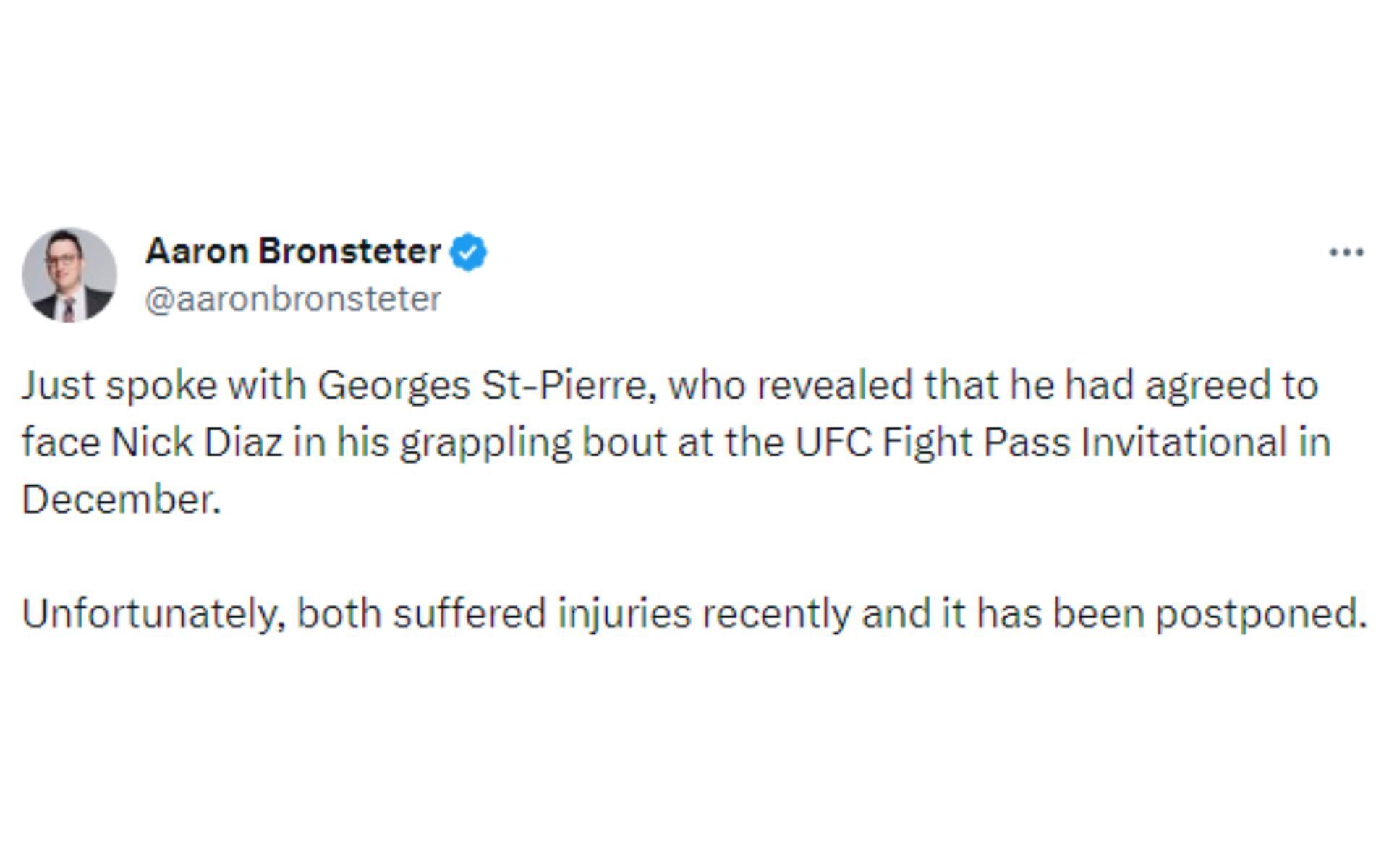 "Just spoke with Georges St-Pierre, who revealed that he had agreed to face Nick Diaz in his grappling bout at the UFC Fight Pass Invitational in December...Unfortunately, both suffered injuries recently and it has been postponed."