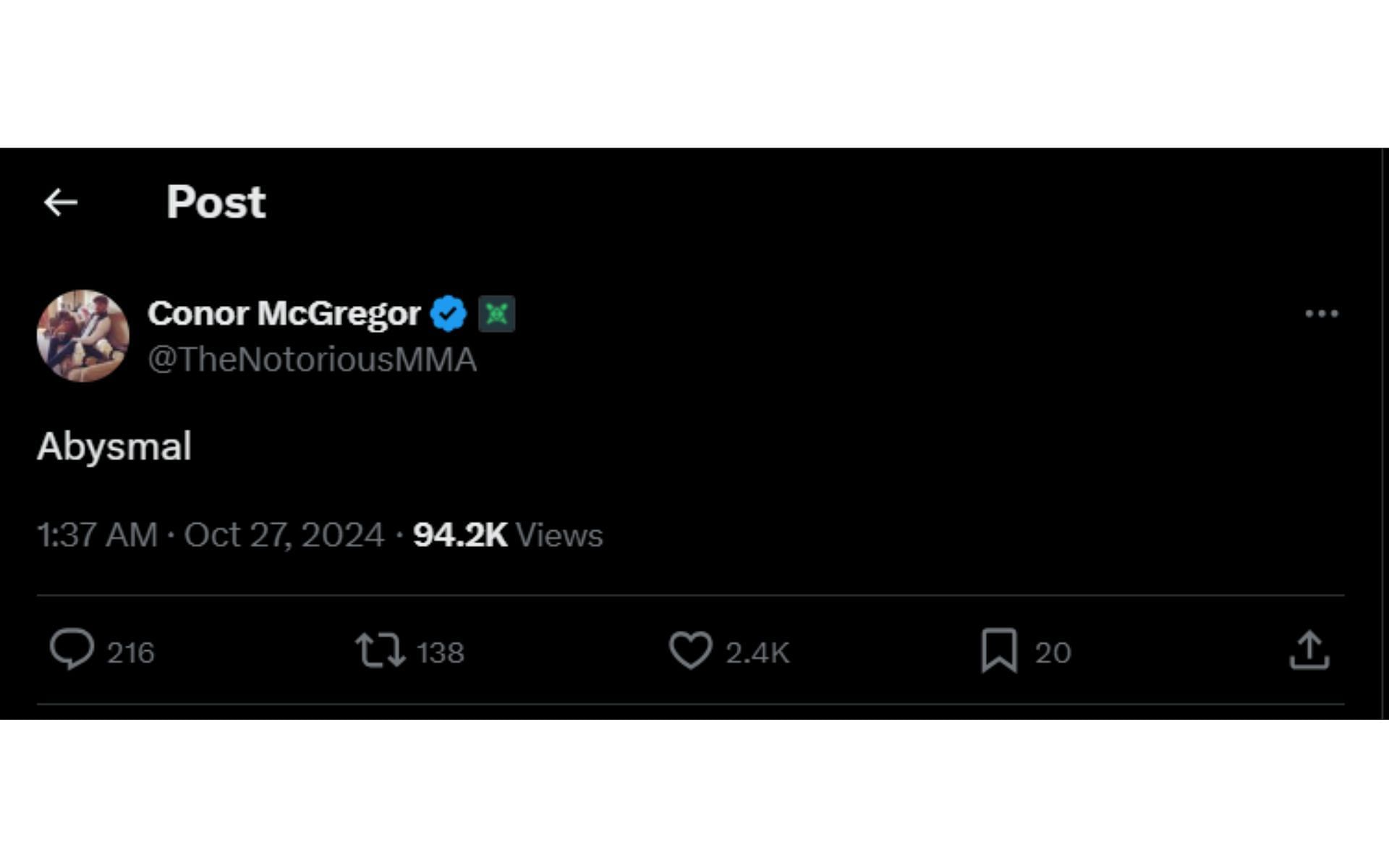 McGregor had placed a $500,000 bet on Whittaker to beat Chimaev and Topuria to beat Holloway. He took to X after Chimaev's victory and expressed his disappointment in one word in a now-deleted post:
