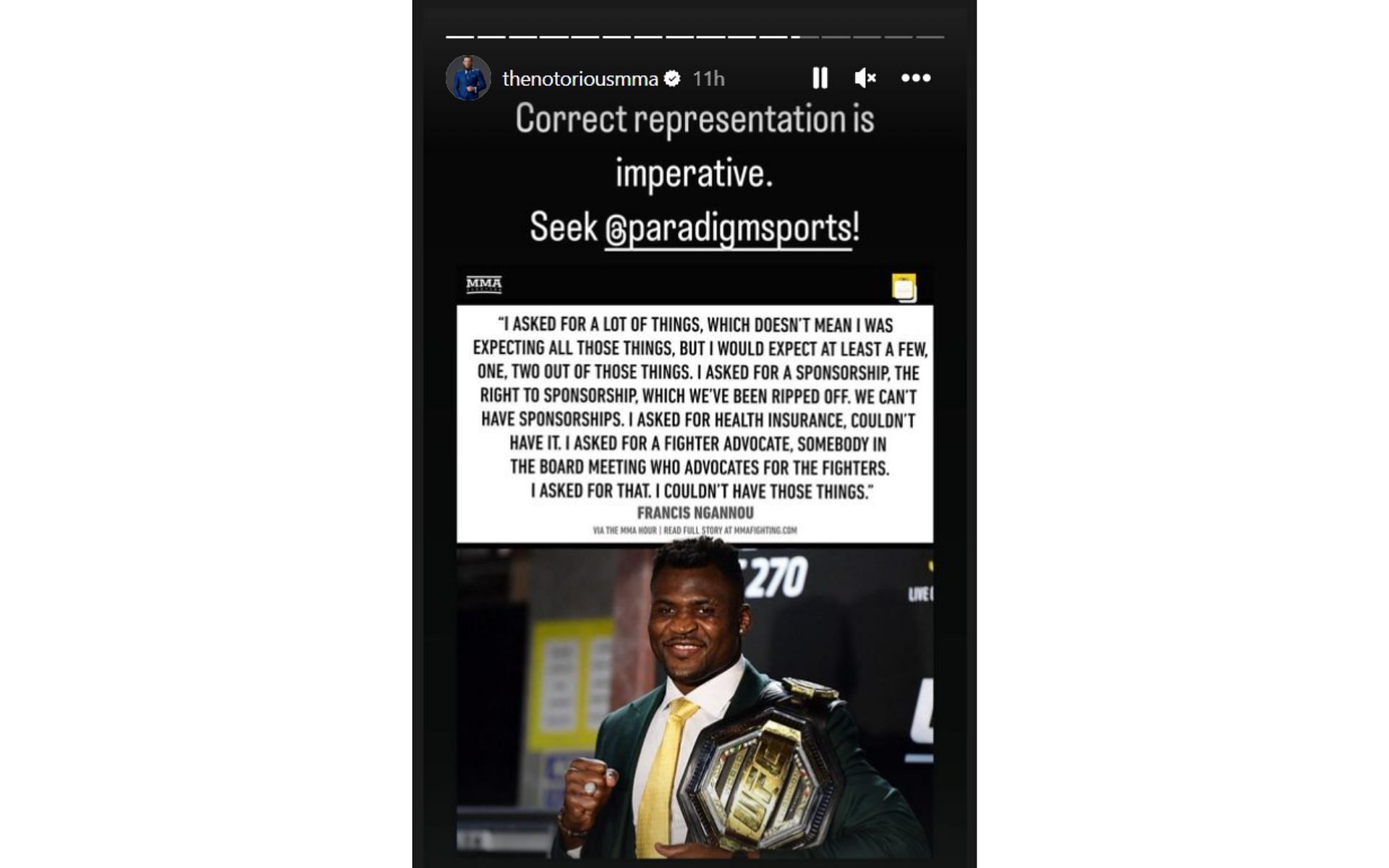 'The Notorious' went on to promote Paradigm Sports management, the firm which represents him and is owned by his close associate Audie Attar. Reacting to Ngannou's comments, the Irishman wrote on his Instagram Stories: