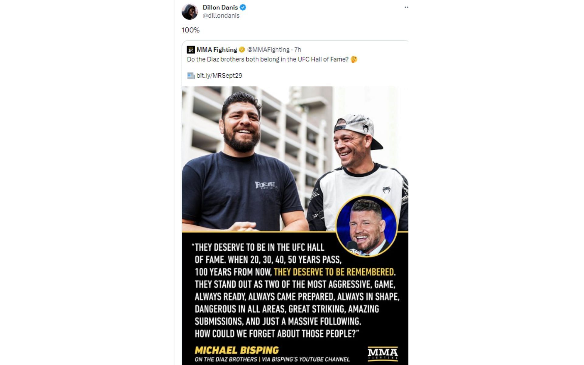 The tweet caught the attention of Dillon Danis, who quoted it and shared a brief response. The Bellator middleweight obviously shared Michael Bisping's sentiments as he responsed by indicating that he believes what the Hall of Famer said was correct: