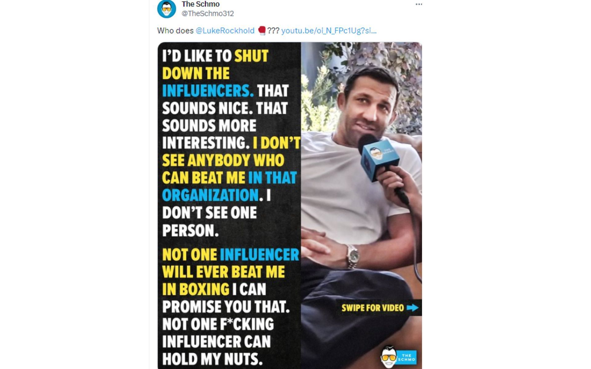 While speaking to The Schmo, the former UFC and Strikeforce middleweight champion noted that he is interested in fighting an influencer in a boxing bout. Rockhold mentioned that he doesn't believe any influencer can hang with him in the squared circle and show the difference in skill level.