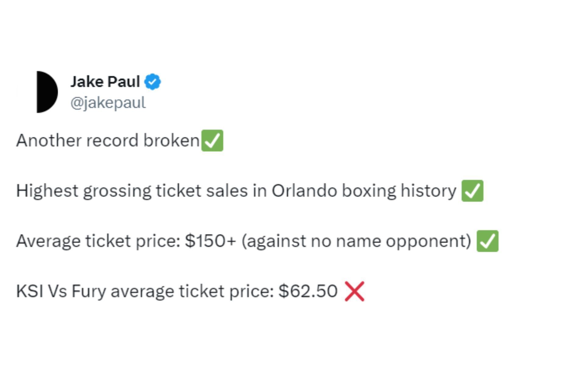 According to the post, Paul vs. August has broken the record for the highest ticket sales in Orlando's boxing history. Additionally, the average ticket price for the event has touched a whopping $150, while it was $62.5 for KSI vs. Tommy Fury.